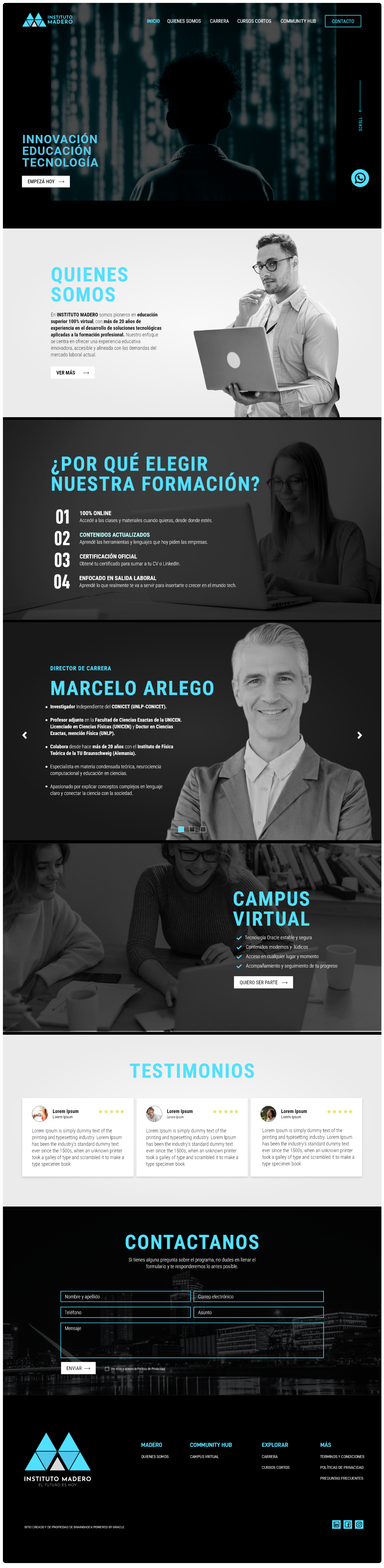 Reto: Crear una identidad visual moderna y un sitio web funcional para una institución educativa online. Solución: Diseñé el logotipo, definí lineamientos de marca y desarrollé la web en WordPress, con diseño adaptable y navegación clara. Resultado: Una marca profesional y un sitio web que refuerzan la confianza de los estudiantes y facilitan la inscripción.